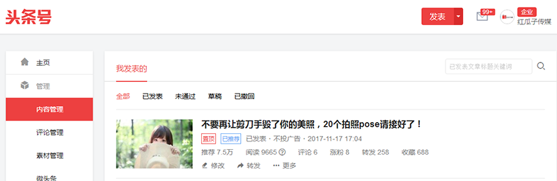翻看日歷,2017年只剩一個(gè)月了,不知不覺(jué)中在紅瓜子工作已經(jīng)4個(gè)月了,回想兩個(gè)月前,老總們?cè)谝淮沃芙Y(jié)會(huì)議上下達(dá)了想要做今日頭條推廣的計(jì)劃。初初聽(tīng)到這個(gè)計(jì)劃我是挺懵的,今日頭條是個(gè)新媒體方向的平臺(tái),毫無(wú)寫(xiě)作經(jīng)驗(yàn)的我,絞盡腦汁也寫(xiě)不出一篇好文章來(lái)。不過(guò)好在,老總們也說(shuō)了,先用我們網(wǎng)站的文章發(fā)布,看看效果在做后續(xù)的調(diào)整。