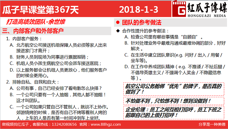 D. 在工作中養(yǎng)成團(tuán)隊精神(e.g. 不推諉/不扯后腿/不提倡英雄主義/不強調(diào)個人獎金/不隱藏信息等)。
