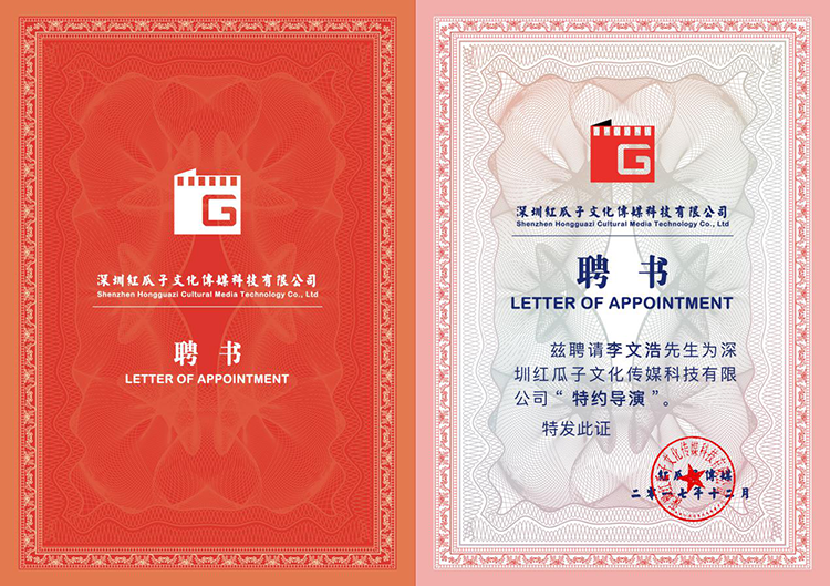 2018年01月09日,深圳紅瓜子傳媒科技有限公司聘請(qǐng)?jiān)胍暱倢?dǎo)演李文浩為特約導(dǎo)演。紅瓜子傳媒總經(jīng)理?xiàng)铐樍衷诠径喙δ軓d給李文浩導(dǎo)演頒發(fā)了聘書。