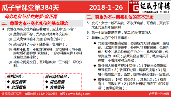 4. 女性在商務(wù)交往場合應(yīng)著裙裝,應(yīng)注意“五不準”: