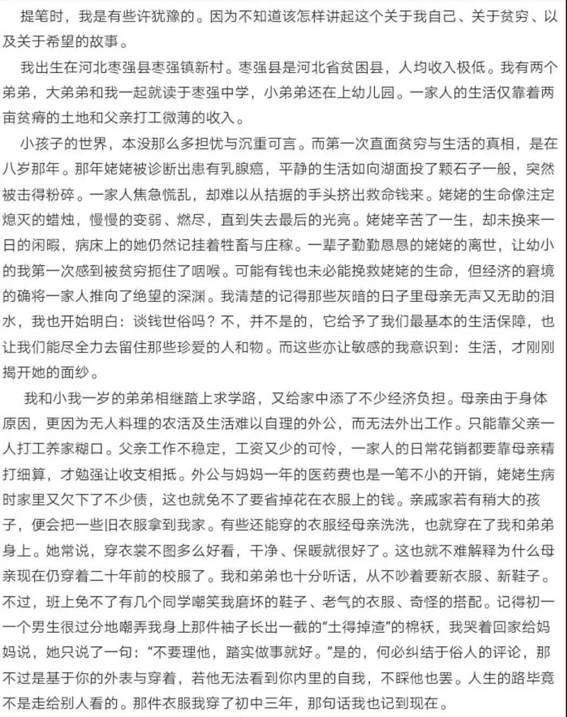 王心儀此前寫(xiě)的一篇關(guān)于自己、關(guān)于貧窮、關(guān)于希望的文章,一經(jīng)發(fā)出以后感動(dòng)了許多網(wǎng)友。