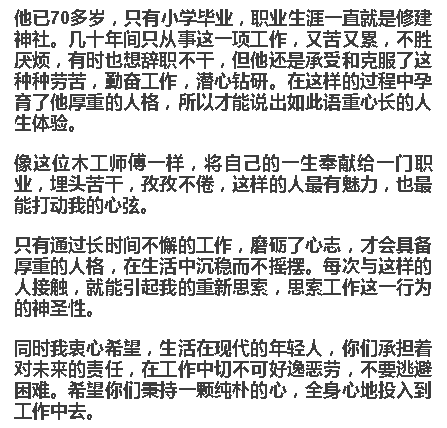 我曾在一個電視訪談節(jié)目中聽過一位修建神社的木匠師傅的話,很受感動。他說: