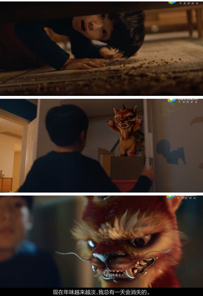 影片中,小男孩偶然發(fā)現(xiàn)家中有“年獸”??上б驗槟晡短?,年獸的身體也越變越小。為了拯救年獸,小男孩召集全家人一起出門迎新年。在熱鬧的氣氛中,年獸終于恢復(fù)“真身”。