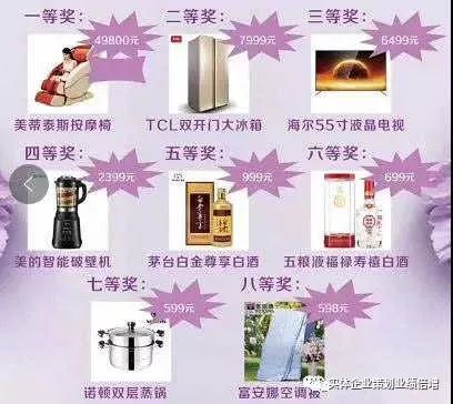 49800元按摩儀、7999元TCL雙開門冰箱、海爾55寸電視機、美的破壁機....最低抽中598元富安娜空調被.....100%中獎,絕無空獎