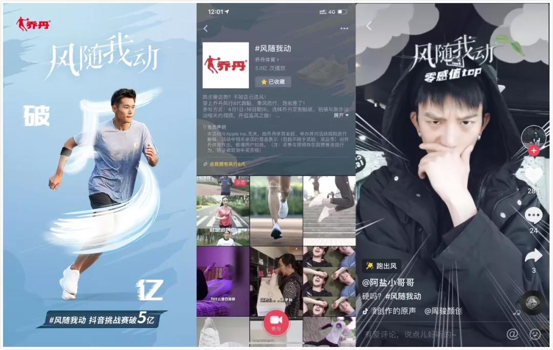 為了向消費者更好地傳遞“風(fēng)隨我動”主題信息,喬丹體育聯(lián)手短跑冠軍林俊泓、抖音跑酷達人,以及城市跑團,組成喬丹追風(fēng)聯(lián)盟,升華活動里的跑步情結(jié);并號召抖音上的跑步愛好者們一起加入到這場追風(fēng)運動中,用短視頻分享自己的追風(fēng)故事。