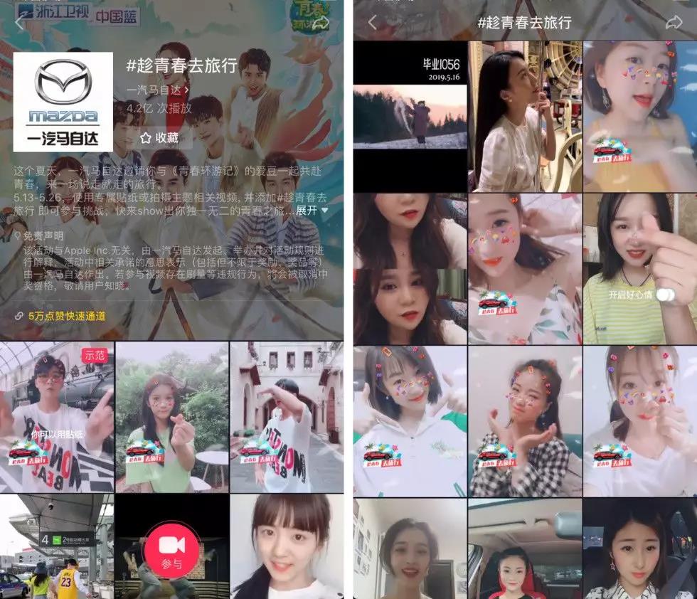 以一汽馬自達(dá)阿特茲&CX-4作為浙江衛(wèi)視《青春環(huán)游記》官方指定用車為契機(jī),5月13日-26日,一汽馬自達(dá)在抖音發(fā)起#趁青春去旅行 話題挑戰(zhàn)賽,用戶使用專屬貼紙或拍攝主題相關(guān)視頻,并添加#趁青春去旅行即可參與挑戰(zhàn)。兩周時(shí)間內(nèi),共計(jì)超過6萬(wàn)用戶創(chuàng)作了關(guān)于“青春&旅行”的短視頻,視頻播放量超過3億,視頻點(diǎn)贊量1000多萬(wàn),【一汽馬自達(dá)】品牌藍(lán)V賬號(hào)粉絲增至31.1萬(wàn)。此次雙方合作主要是針對(duì)年輕用戶群體深度傳遞一汽馬自達(dá)“趁青春去旅行”的品牌精神,獨(dú)有的個(gè)性和價(jià)值主張贏得了眾多忠實(shí)粉絲,建立了強(qiáng)烈的品牌認(rèn)同。