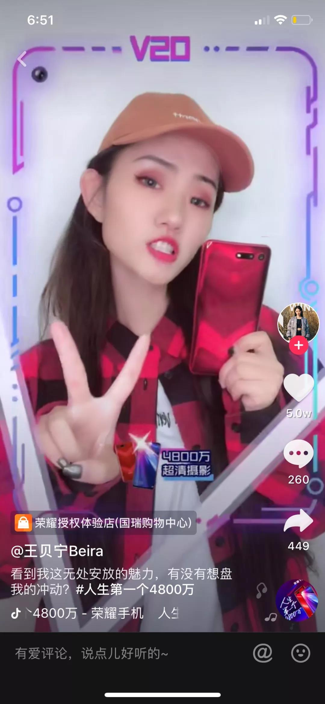 “從一無(wú)所有到第一個(gè)30萬(wàn)真的很不容易”,常刷抖音的人對(duì)這個(gè)旁白一定不陌生。這個(gè)熱門BGM就像學(xué)貓叫、好嗨哦一樣,只要前奏響起來(lái),每個(gè)人的腦海里都會(huì)自動(dòng)接上下一句。由此可見(jiàn),一款熱門BGM對(duì)于視頻傳播的幫助極大?;趯?duì)平臺(tái)玩法的爛熟于心,榮耀手機(jī)此次的挑戰(zhàn)賽,巧妙改編了抖音“第一個(gè)30萬(wàn)”熱門BGM,在2400萬(wàn)后融入4800萬(wàn),并配合視頻反轉(zhuǎn)為清晰美型的畫面。V20的4800萬(wàn)超清攝像功能伴隨著入耳的BGM,成為膾炙人口的產(chǎn)品slogan