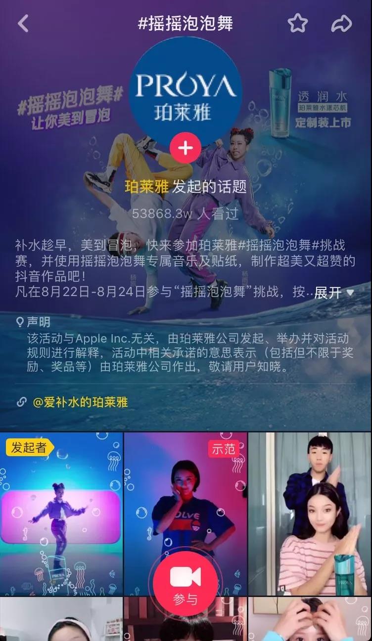 珀萊雅這次攜手抖音一姐吳佳煜、田峻彰、沙特阿拉白公主、小安妮大太陽等抖音最火紅人發(fā)起舞蹈挑戰(zhàn),引起抖音5億人觀看。隨著這輪轟炸式舞蹈挑戰(zhàn)傳播,透潤水的熱度在抖音極速上升,很多網(wǎng)友求問“抖音同款“美到冒泡的產(chǎn)品,被深深種草。