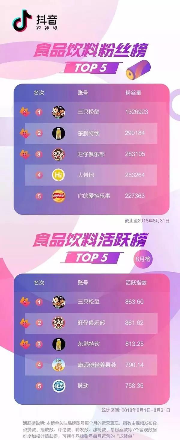 在排行榜中,三只松鼠粉絲量、活躍指數(shù)都踞行業(yè)榜首;東鵬特飲和旺仔俱樂部在粉絲數(shù)和活躍指數(shù)排行中都躋身前三。此外,“脈動(dòng)”發(fā)布了26個(gè)作品,獲得約150萬的播放量;“康師傅輕養(yǎng)果薈”也表現(xiàn)出色,整個(gè)8月共收獲125萬點(diǎn)贊。