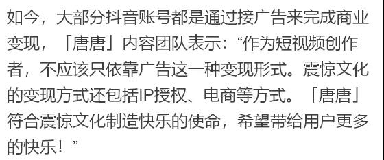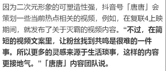 「唐唐」內(nèi)容團隊說:“今年1月份才入駐抖音,最初其實是純粹想吐槽,沒想到一下就火了。看到市場熱度很好,我們就接著繼續(xù)做了下去?!?/span>
