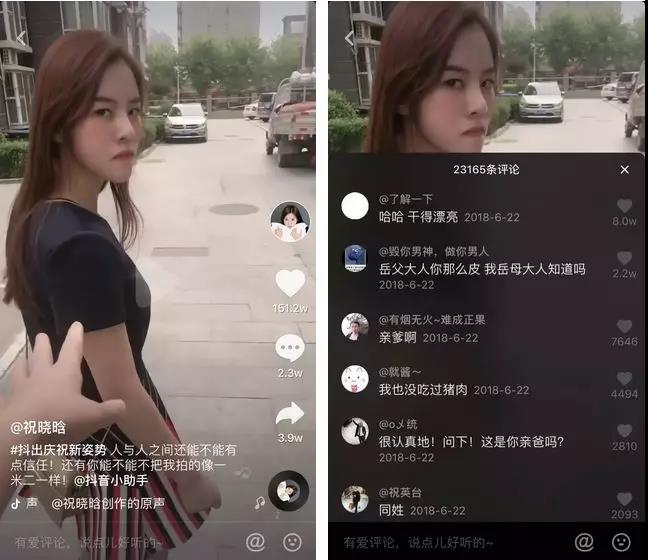 一開始我們也像大多數(shù)人剛做抖音的時候一樣,模仿抖音熱門,對個口型,跳個舞蹈,像祝曉晗的第一條視頻內(nèi)容,就是祝曉晗在我們樓下的商場里,跳的一個舞蹈。