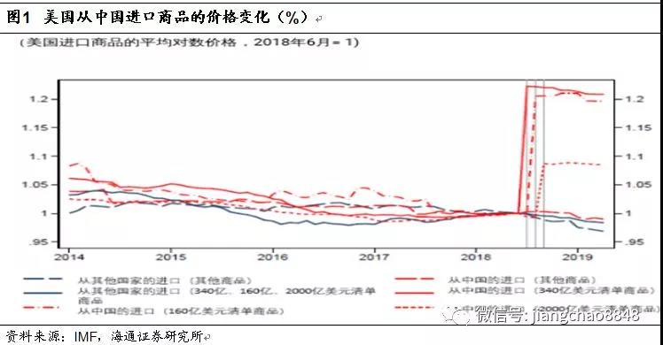 隨后IMF在5月份發(fā)布了一份重要的報(bào)告《TheImpact of US-China Trade Tensions》,研究了加征關(guān)稅后中國(guó)對(duì)美出口產(chǎn)品到岸價(jià)的變化,發(fā)現(xiàn)最早500億美元商品關(guān)稅上調(diào)25%之后,美國(guó)到岸價(jià)漲幅在20%左右;而2000億美元商品關(guān)稅稅率上調(diào)10%之后,美國(guó)到岸價(jià)漲幅在8-9%。也就是說(shuō),對(duì)中國(guó)產(chǎn)品征收的關(guān)稅絕大部分體現(xiàn)為到岸價(jià)的提升。