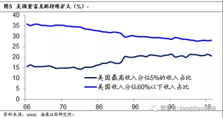 根據(jù)美國(guó)商務(wù)部普查局的數(shù)據(jù),美國(guó)住戶(hù)中收入低于60%分位的家庭,其收入占比已經(jīng)從1966年的36%降至目前的28%。而在考慮了通脹的變化以后,美國(guó)收入低于40%分位的家庭,其實(shí)際收入在過(guò)去40年幾乎沒(méi)有變化。