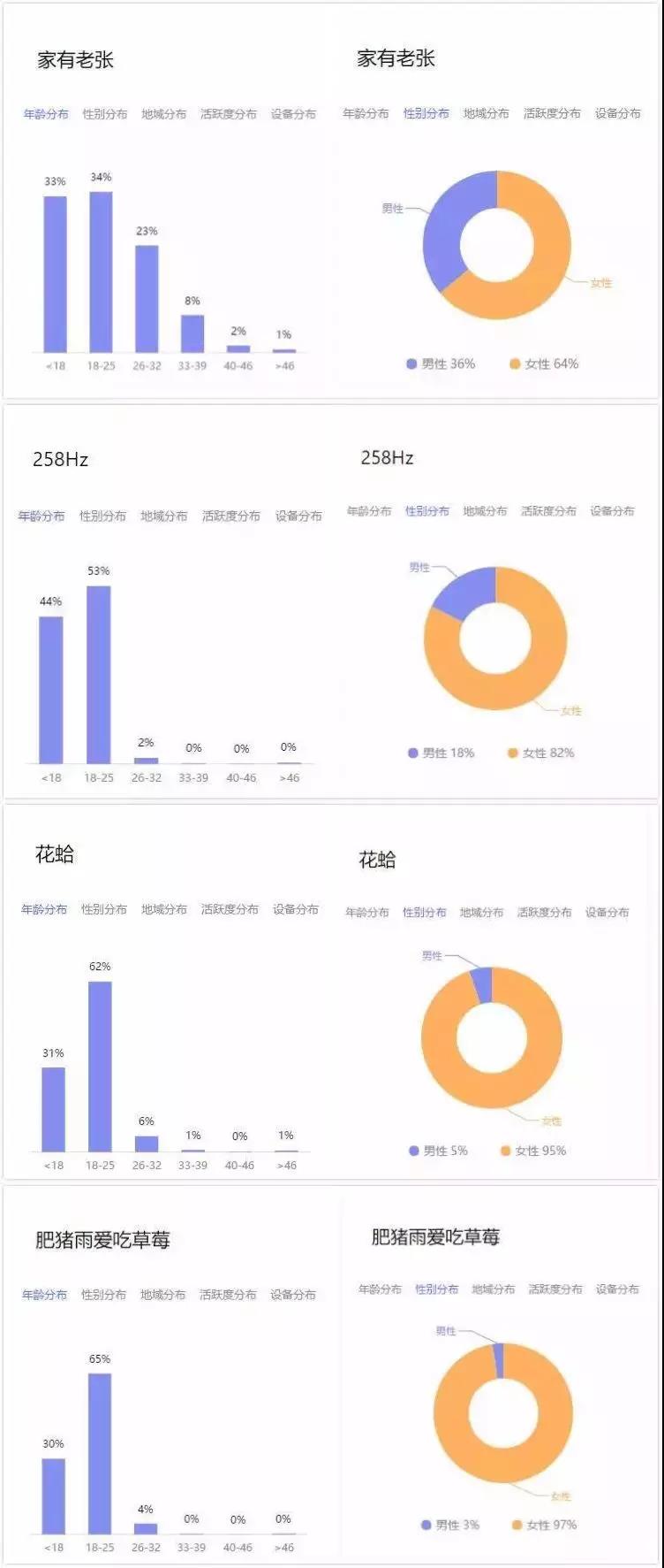 但他們都有一個(gè)共同點(diǎn):關(guān)注這些賬號(hào)的用戶大多都是18-25女性——這也是完美日記的目標(biāo)用戶的典型特征。