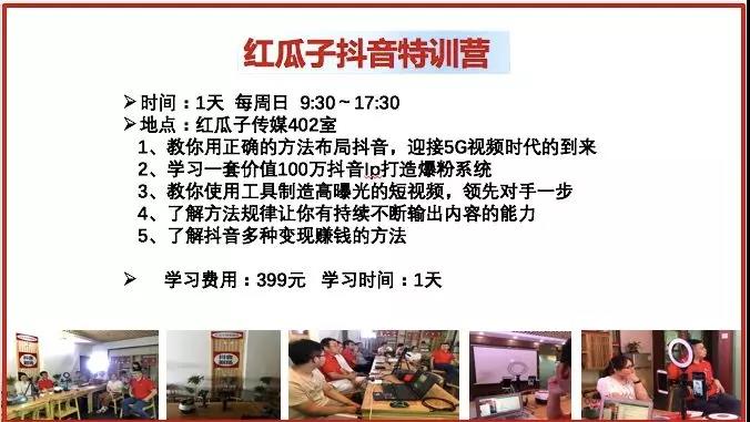5G時代來臨,信息以短視頻形式來傳播,抖音是全球短視頻流量最大的平臺,沃爾瑪一條抖音增加2000萬收入,一條抖音為華為手機單店增加650萬收入,怎樣用好抖音,對我們個人和公司都非常重要,紅瓜子抖音研究院每天都有組織《抖音劇場》節(jié)目和每周日都舉行《抖音特訓(xùn)營》培訓(xùn),歡迎大家積極參加