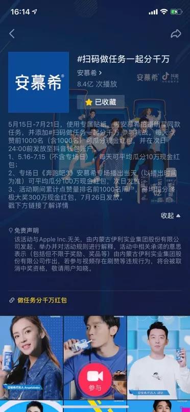 5月15日-7月21日,打開抖音掃描【安慕希x抖音】新包裝二維碼,完成指定任務(wù)并在當(dāng)天24:00前按要求在抖音平臺上傳任務(wù)視頻。點贊排名前1000名(包括第1000名)即可瓜分現(xiàn)金紅包。本次傳播巧妙的以產(chǎn)品為開頭,將傳播的核心基于產(chǎn)品,讓線下購買行為反饋到線上UGC內(nèi)容,互動內(nèi)容同時與品牌產(chǎn)生聯(lián)名款產(chǎn)品進(jìn)行閉環(huán)式的營銷。