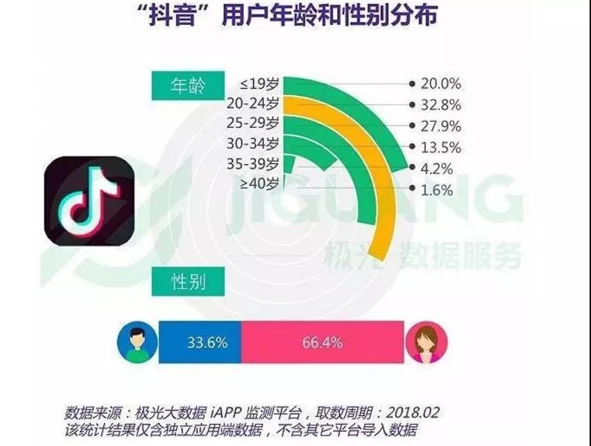 據官方數據顯示抖音的用戶中,女性占比(66.5%)顯著高于男性(33.6%),24歲以下的用戶占到了52.8%,也就是說,抖音是一個年輕女性占主導地位的平臺。
