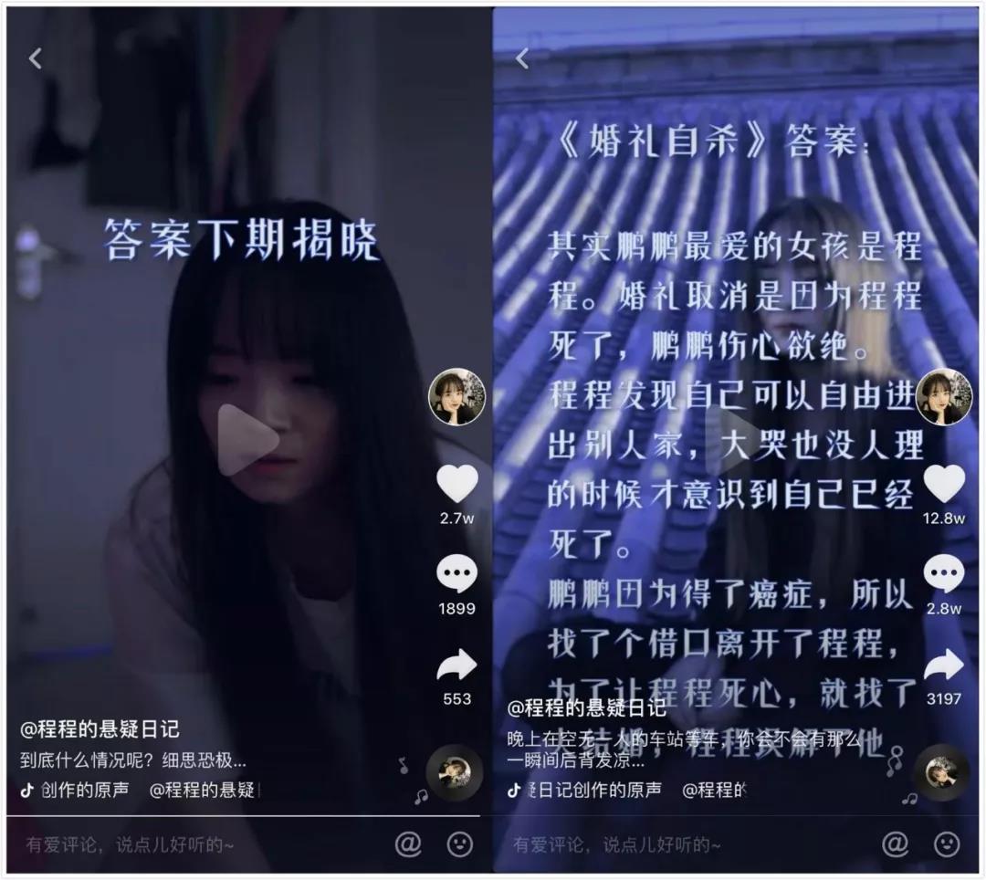 由于抖音對視頻的時間限制,以及視頻播放量和完播率對抖音流量推薦的影響,「程程的懸疑日記」等懸疑類賬號會通過在視頻結(jié)尾提醒推理答案在下期視頻結(jié)尾,由此提高視頻點(diǎn)擊量和完播率,讓觀眾有“在抖音看豎屏連續(xù)劇”的感覺。