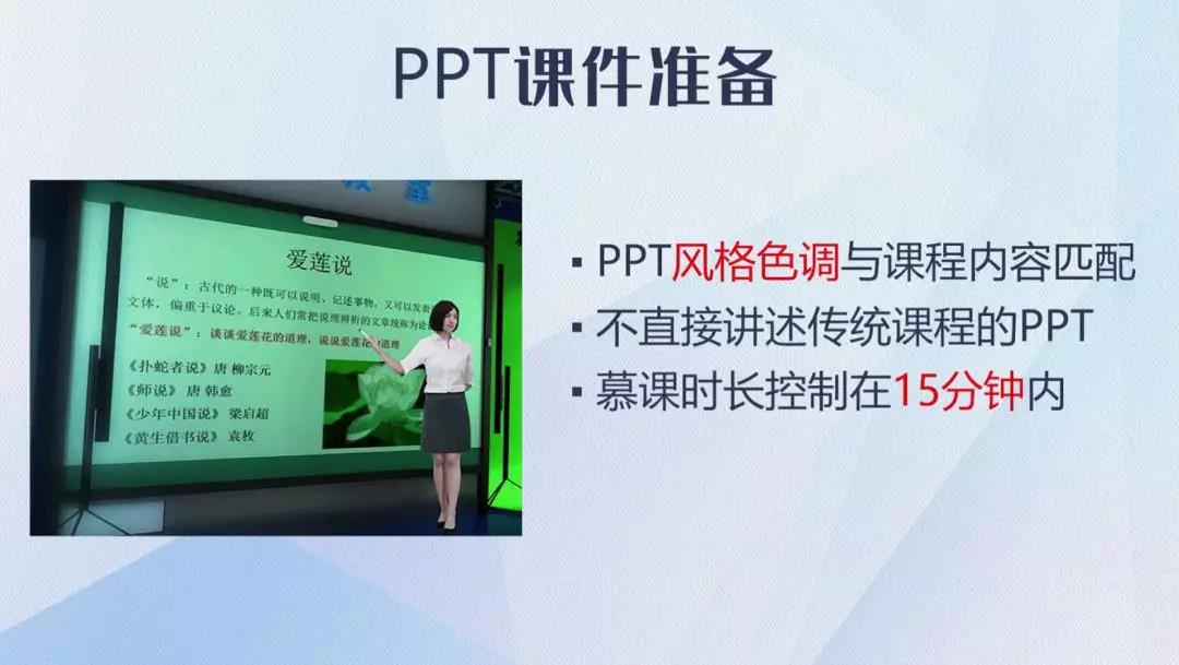 拍攝慕課出鏡老師準備事項1.授課ppt準備PPT課件要求PPT應盡量簡潔,每一頁內(nèi)容不要太多,最好是一張圖,一行要點。