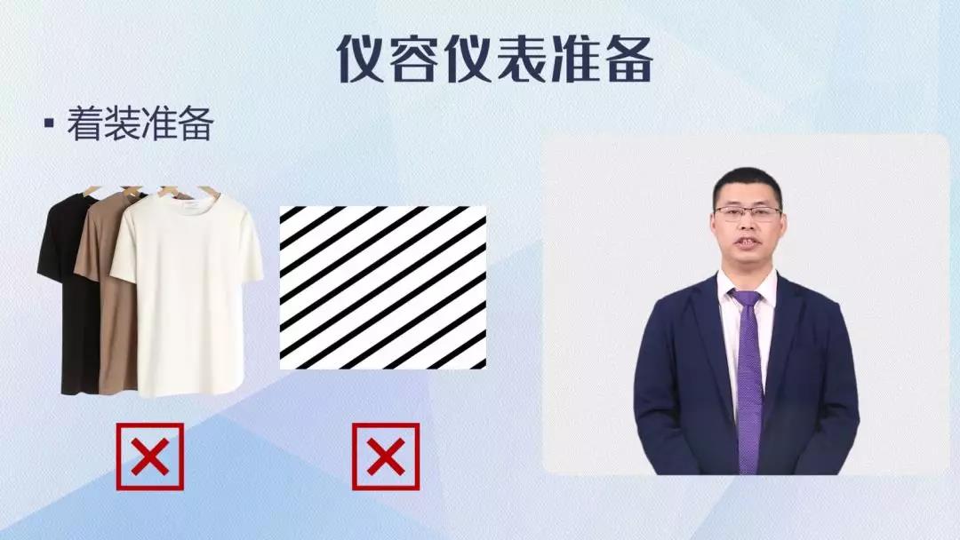 2.PPT課件需要熟練講解著裝的要求規(guī)范最好不要穿短袖或條紋衣服錄課一般課程視頻應適合每個季節(jié)觀看,若在暑假期間錄制課程視頻建議老師著正裝或長袖襯衣錄制,避免學生在冬天的時候看老師的視頻覺得“冷”;冬天錄制課程視頻也切忌著羽絨服拍攝課程視頻,否則也會使視頻看起來不自然。